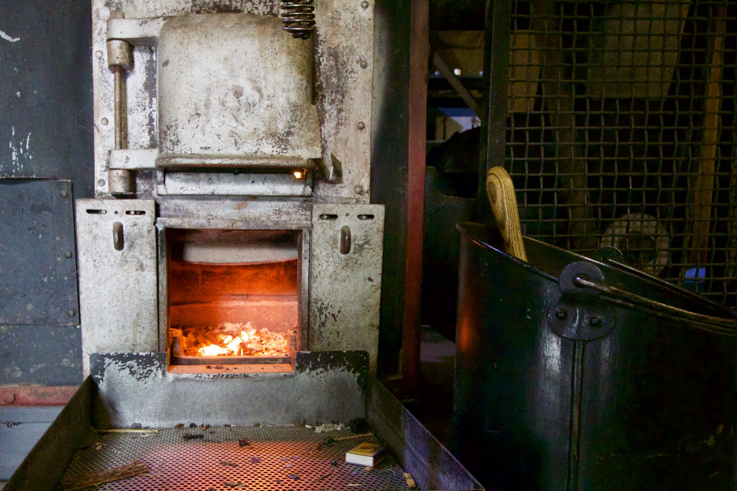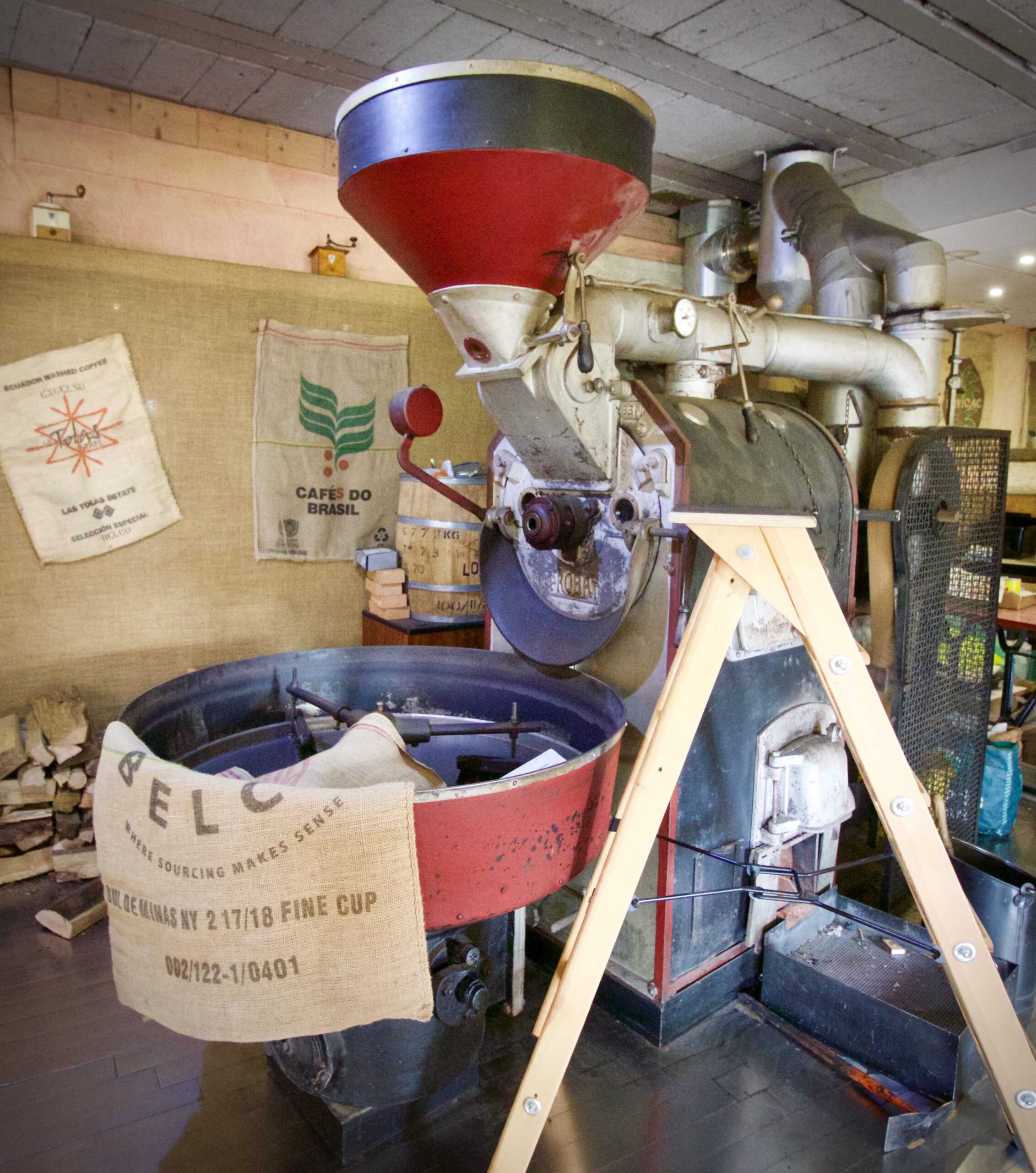 Devant la machine et avec un de nos torréfacteurs, les visiteurs pourront participer à la transformation des grains verts aux grains fraichements torréfiés ; avec la dernière machine de France datant de 1935 fonctionnant au bois.